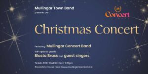 Mullingar Concert Band are delighted to present their Christmas concert at Bloomfield House Hotel, on December 6th, at 7.30pm. Under the baton of conductor and friend of the Mullingar Concert
